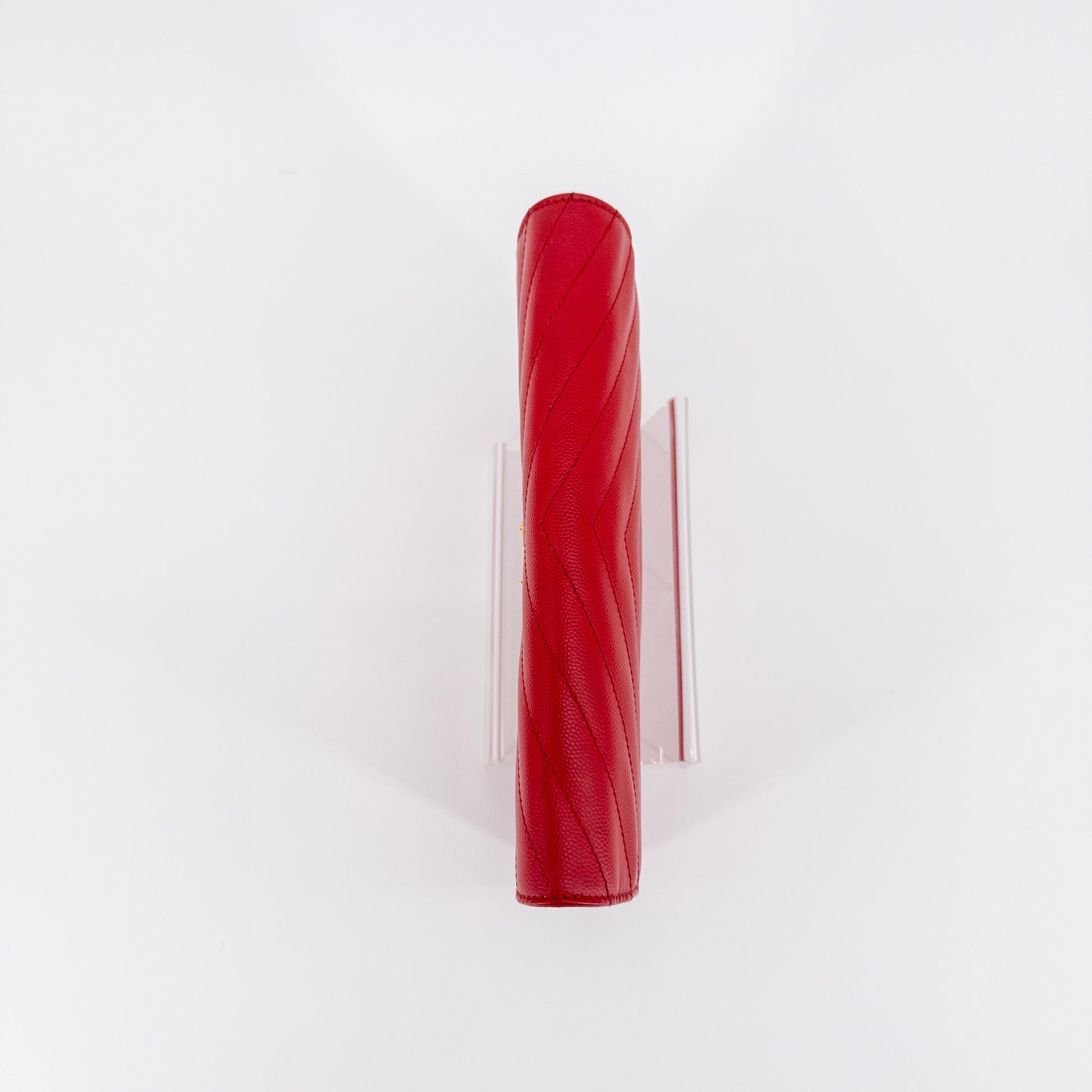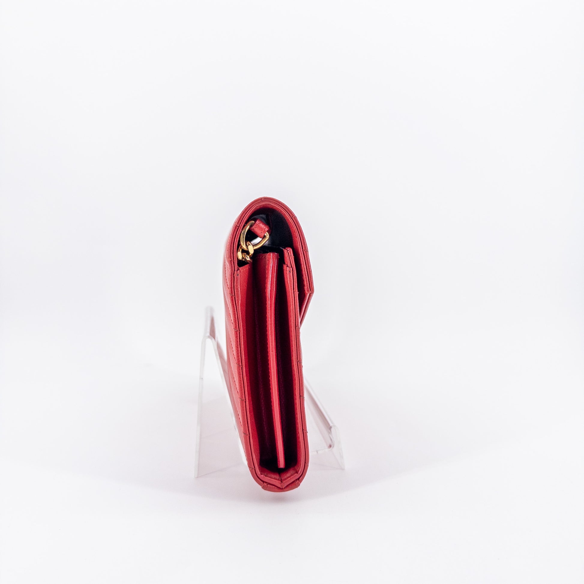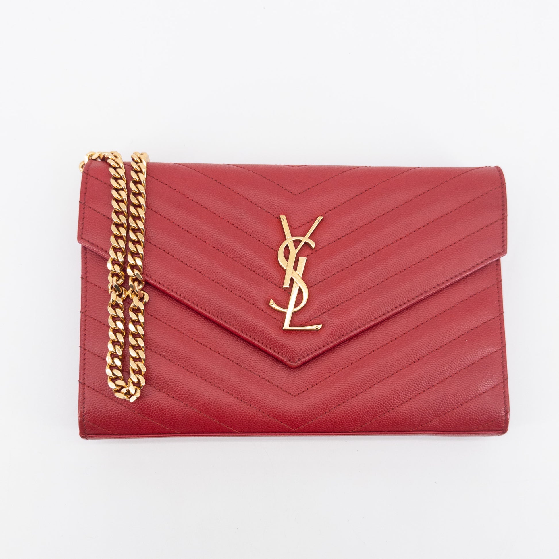 This striking Saint Laurent Wallet on Chain adds a bold pop of color to any outfit. Crafted in luxurious red grained leather with signature chevron quilting, it features the iconic gold-tone YSL logo and matching chain strap — the perfect accessory for day-to-night chic.